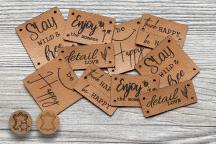 Set med fem olika motiv – antingen som vegansk och tvättbar etikett i konstläder eller av naturläder för handtillverkade saker som inte behöver tvättas så ofta.
