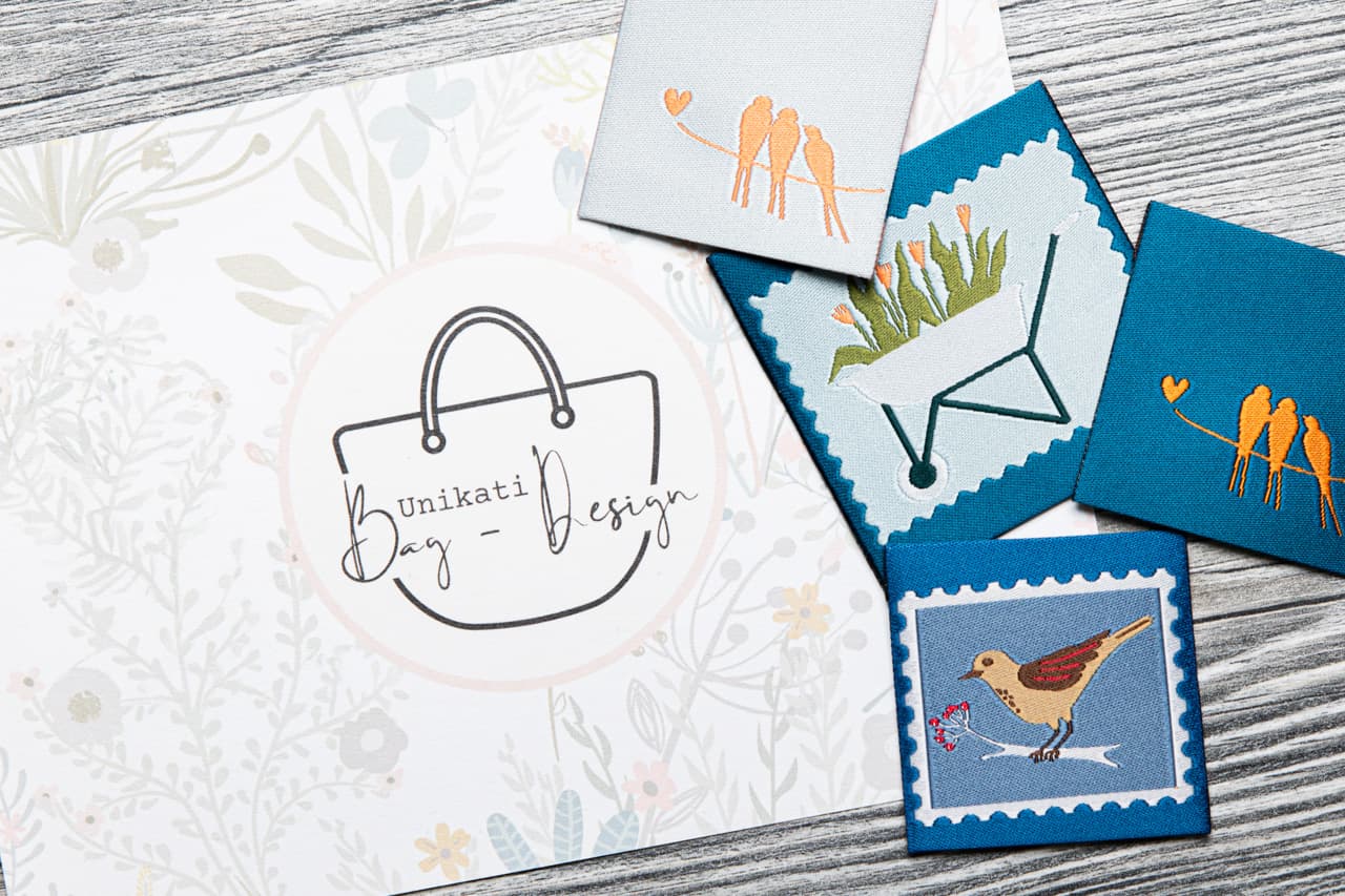 De fyra motiven visar olika scener. Blomskottkärran känns levande och hantverksmässig. Fågeletiketten påminner om en liten illustration i etikettstil. De två fågeltrio-motiven upprepar temat i två varianter och skapar rörelse på väskor, ryggsäckar eller accessoarer. Du använder etiketterna som ett medvetet synligt detaljelement.