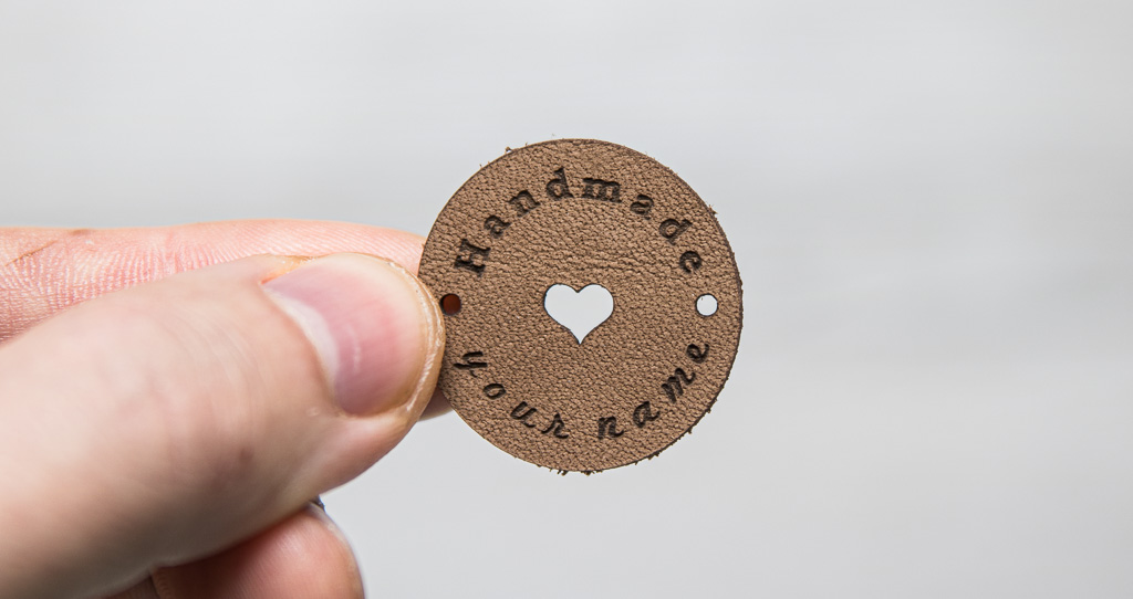 Läderetikett gjord av naturligt läder, lasergraverad, anpassa helt enkelt text, motiv och avsnitt i konfiguratorn.